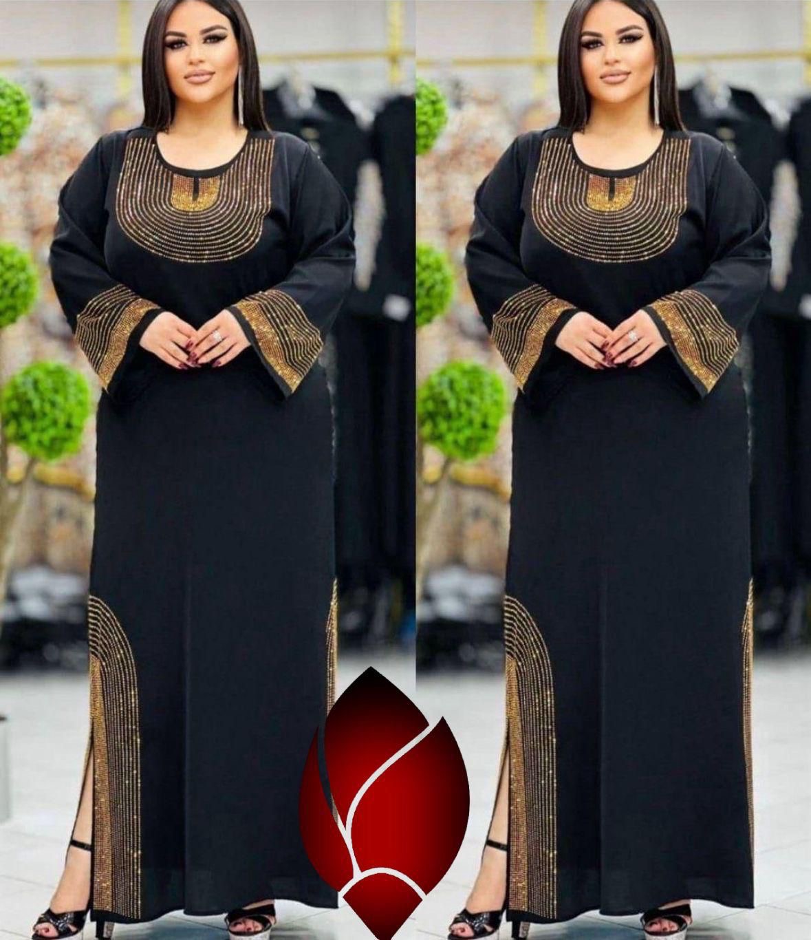 This elegant black gown features stunning gold embellishments that add a touch of sophistication. The neckline is adorned with intricate, circular gold patterns that draw attention to the upper body. The wide sleeves are also accented with gold detailing, creating a balanced and luxurious look. The gold embroidery continues down the side slits of the dress, adding an eye-catching element as the wearer moves. Paired with sleek, open-toe heels, the overall outfit is chic, graceful, and perfect for formal occasions.